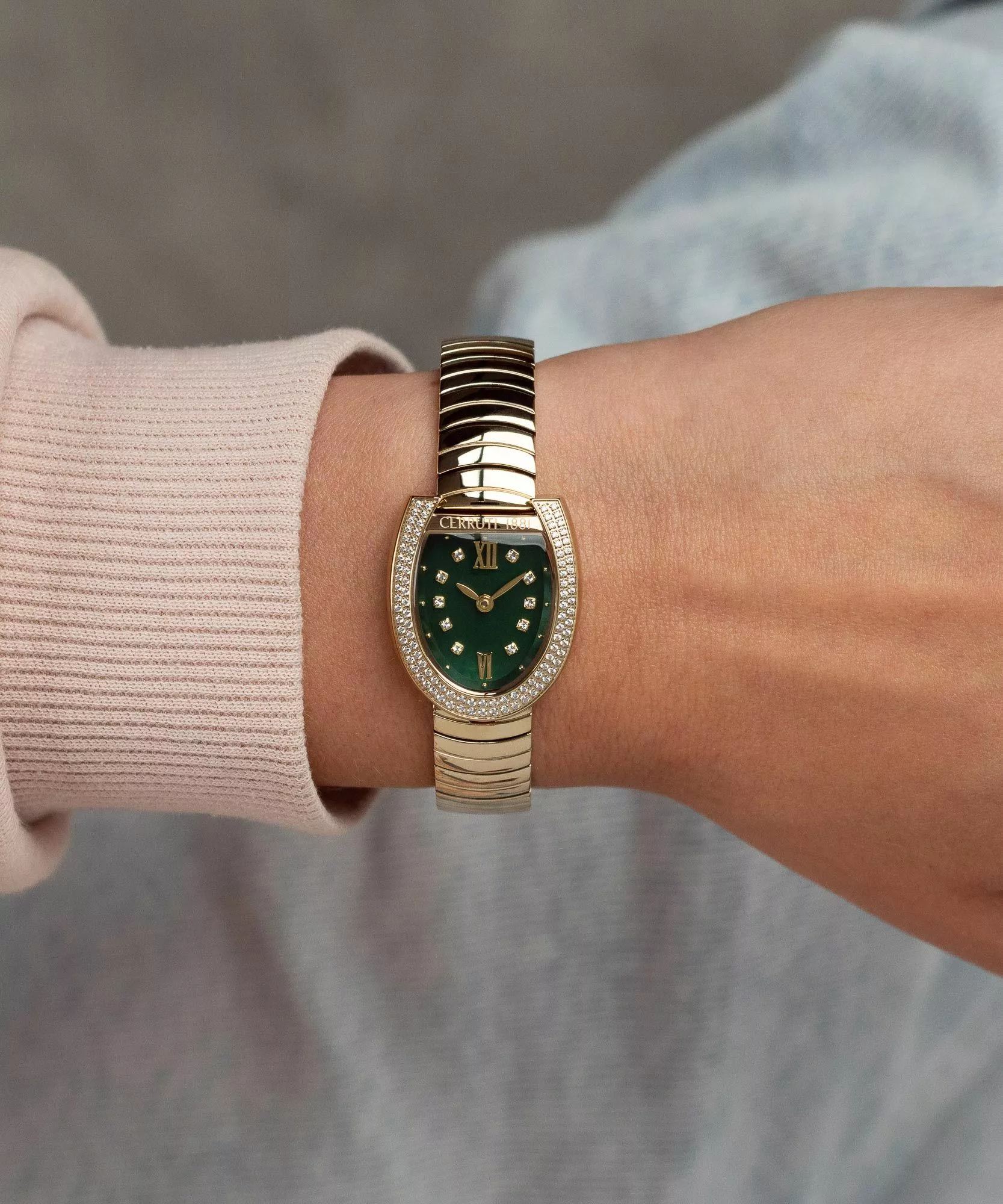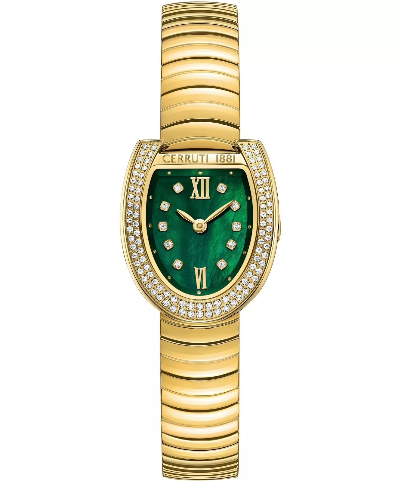 La montre Cerruti 1881 CIWLG0074105 femme élégante est un bijou raffiné au cadran vert et finition dorée.